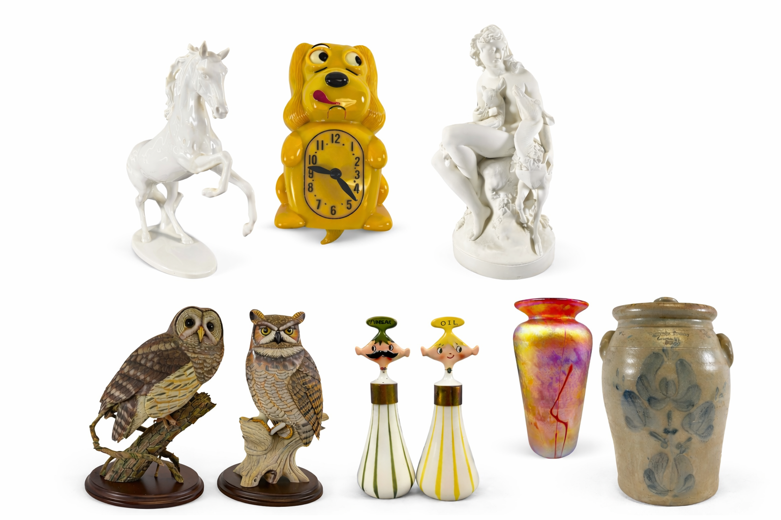 This online auction presents an exceptional collection of upscale collectibles and decorative treasures gathered from a variety of refined estates. The sale features an eclectic yet sophisticated array of items including fine pottery, sculptures, artwork, artisan duck decoys, horse-themed collectibles, clocks, trinkets, vintage teddy bears, and elegant vintage Saks Fifth Avenue fashions.